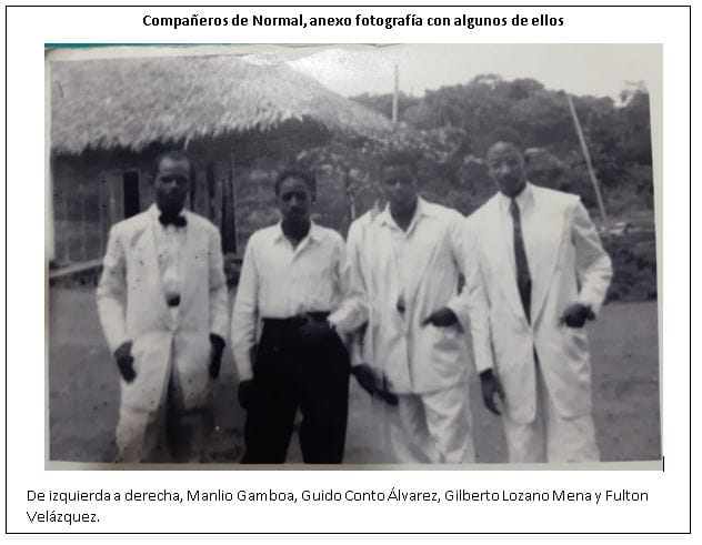 No podría terminar esta nota sin acercar a los quibdoseños de hoy a este simpático y recordado personaje, y lo hago citando a “Pocholo”, Ember Mosquera, “Tente” el hijo mayor del “Mono” Díaz; quienes, según dan cuenta vecinos de Cali, frecuentaban al profesor Manlio en los últimos años; mencionar también a sus vecinos de “Tres brincos” tales como: Magüí, Miguel “Diabluras”, “la R” –mujer de Nicolás “Tronchado”, padres de Leyla, “Berengenito” y Chavela, ya que a Manlio padre, lo crió doña Sergia, a quien en alguna edición mencioné como fututa de esta parte de La Alameda, llegando a la 24 con 5ª., a su compadre Hernán Palacios -Integrante de SIVA–, a Cucalón Mena, quien pasa una cómoda vejez también por la ciudad de Cali, al gran “Charini”, y a sus condiscípulos de la normal, con quienes aparece en la foto que acompañamos.
