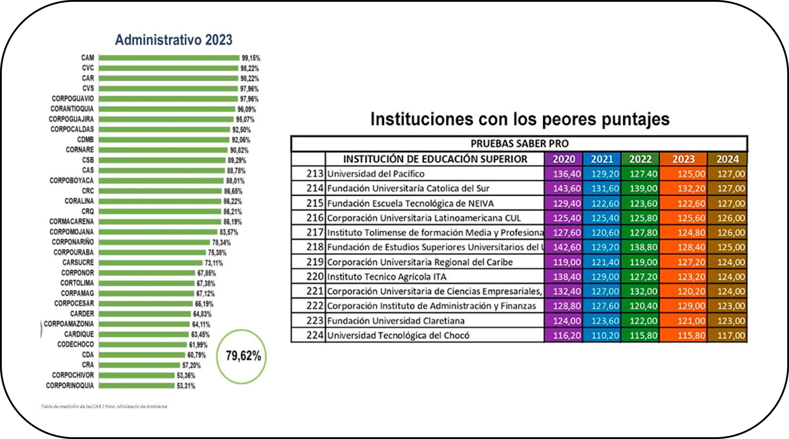 De otro lado, el pasado 6 de marzo, importantes medios de comunicación, entre ellos la Revista Semana, publicaron un informe oficial del Ministerio de Ambiente y Desarrollo Sostenible, con corte a diciembre del 2023 sobre el desempeño administrativo de las Corporaciones Autónomas Regionales y de Desarrollo Sostenible, advirtiendo en dicho informe que, Corporinoquia ocupó el último lugar entre las 33 entidades regionales, y la Corporación Autónoma Regional para el Desarrollo Sostenible del Chocó, el puesto 29, es decir, el 5o. puesto de atrás hacia adelante, informe que servirá para que dichas corporaciones refuercen los procesos de toma de decisiones, prioricen la asignación de recursos, mejoren la planificación de acciones de seguimiento y la evaluación de trámites ambientales. He de advertir a los que se usufructúan de las mínimas en esta entidad, o de las licencias temporales, que no copio de amenazas, de torciones de ojos, ni de hijueputazos entre labios, porque las menciones que hago en mis escritos o columnas, sobre todo en esta entrega, no tienen nada de personal contra quienes regentan las instituciones ahora o lo hicieron en el pasado, y más bien, empezando por esta nota, es una invitación a que, quienes hacen la institución: Rectores, directores, consejos directivos o superiores y funcionarios encargados de ejecutar las políticas, acepten los errores, hagan los diagnósticos y elaboren los respectivos planes de mejoramiento, con el compromiso de todos para ejecutarlo, y así poder salir de los últimos lugares que muestran los indicadores y a donde nos ha llevado la falta de compromiso, la falta de amor propio y sentido de pertenencia, la politiquería, por entregarles las instituciones coincidencialmente al mismo grupo político que todos conocemos.